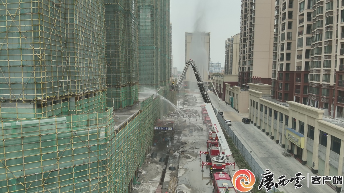 演练设定在武宣县城中村改造项目湖畔华庭B区在建工地,模仿因施工焊接点燃修建外外表防护网及相关外墙资料,可燃物掉落,导致火势一起向上向下延伸,构成立体火灾。武宣县消防救援大队敏捷集结城北消防救援站、马步及二塘小型消防救援站等多支力气赶赴现场处置。