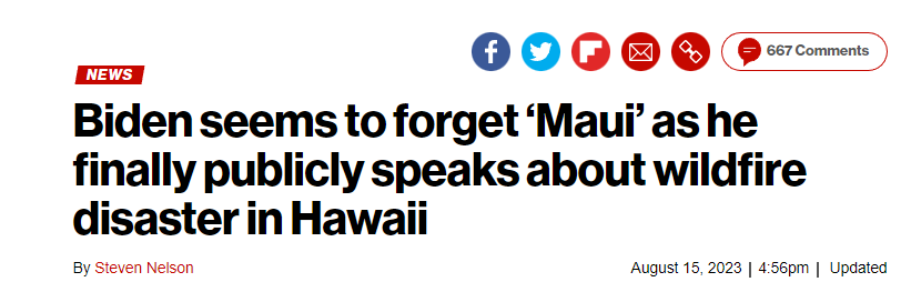 夏威夷毛伊岛的大火造成了严重的人员受伤或死亡和财产损失,而美国总统拜登8月13日就毛伊岛火灾事件作出了“不予置评”的回应,在多次被问及何时前往慰问时,他一直未作公开回应,这种避而不谈的冷漠态度招致广泛批评。
